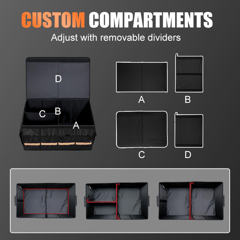 ÉCONOMIE D'ESPACE – Conçue avec une structure pliable, la boîte s'aplatit lorsqu'elle n'est pas utilisée. Cette fonctionnalité aide les conducteurs à économiser un espace précieux dans le coffre et évite un encombrement inutile. Qu'elle soit rangée dans le véhicule ou à la maison, son design compact et pliable assure une manipulation facile, permettant aux utilisateurs d'équilibrer efficacité de rangement, portabilité et commodité.