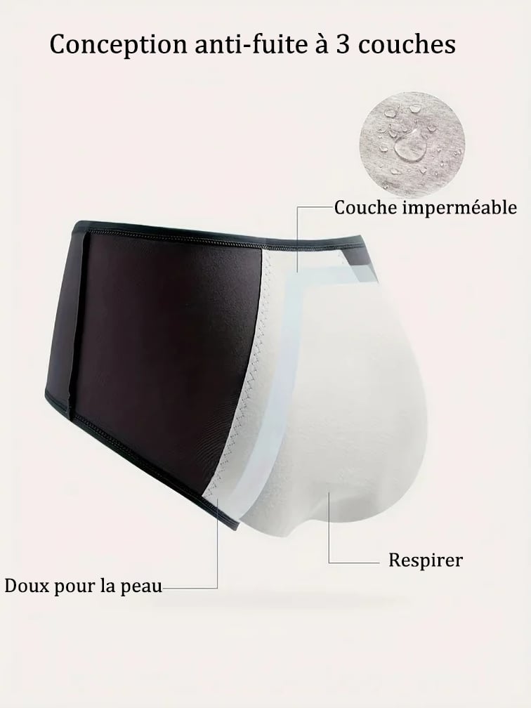 Nos culottes sont livrées avec trois couches de matériau de protection anti-fuite :