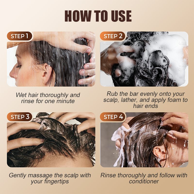 ÉTAPE 2 : Appliquez la barre shampooing : Frottez la barre uniformément sur le cuir chevelu, faites mousser et appliquez la mousse sur les pointes.