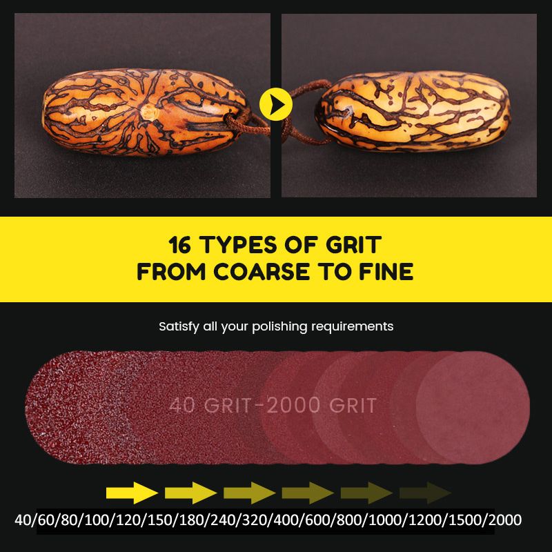 Cet assortiment de disques de ponçage incluant 16 types de grains, couvre tous vos besoins : élimination de rayures/rouille, ponçage, polissage, meulage fin, lustrage, etc.